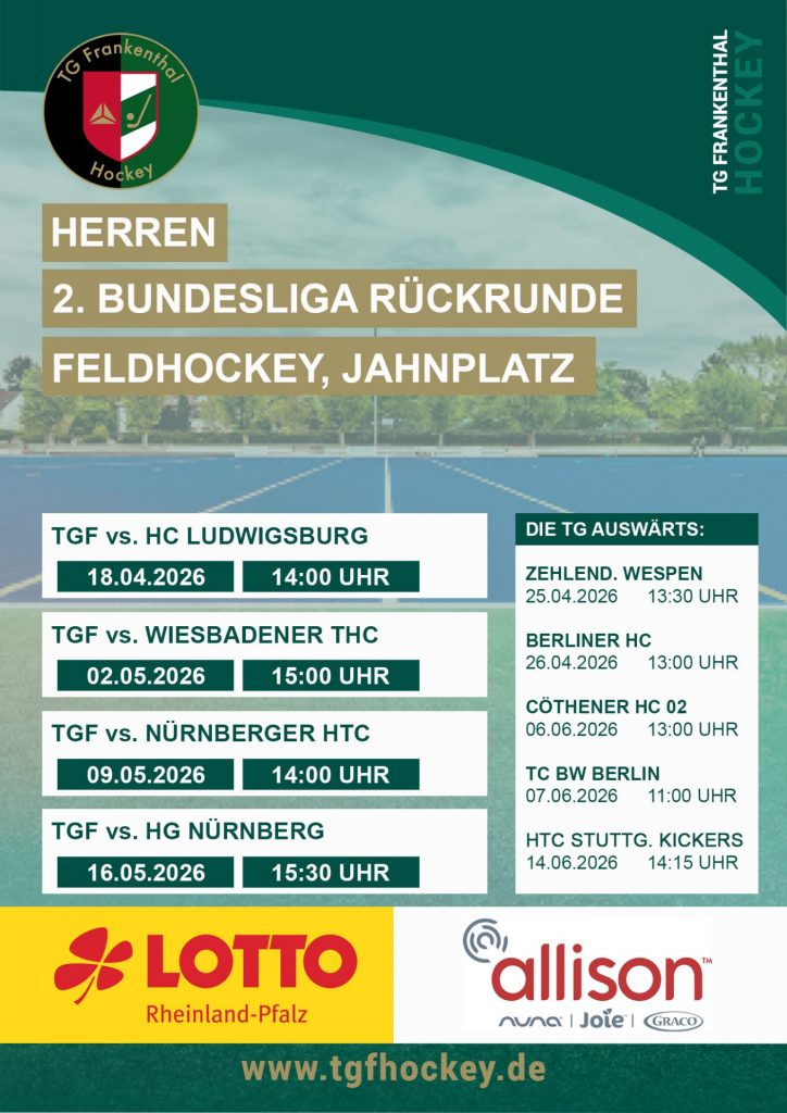 Ballschule Frühlingskurs 2025BallschuleSommer-Ballschule-Kurs 2026Buchung jetzt möglich!Infos Ballschule 19.02.2026: Neuer Co-Trainer für die 1.Herren Wir freuen uns sehr, heute ein neues Gesicht an der Seitenlinie unserer 1. Herren vorstellen zu dürfen: Marco Mertz unterstützt Strohhutfest im TGF-Zelt Vier Tage, sechs Bühnen, tausende von Strohhüte: Ende Mai verwandelt sich die Frankenthaler Innenstadt alljährlich in eine riesige Partymeile. Zum 1. Damenmannschaft sucht Trainer*in Die TG Frankenthal sucht für Feldsaison 2025/26 eine Trainer*in für ihre 1. Damenmannschaft Die TG Frankenthal ist ein traditionsreicher Verein 03.02.2025: Tim Albrecht neuer Trainer der wu14 TG Frankenthal verpflichtet Tim Albrecht als neuen Trainer der weiblichen U14 Frankenthal, 03.02.2025 – Die TG Frankenthal freut sich, für Rheinpfalz: TG Frankenthal bleibt erstklassig (15.01.2024) Hockey: Dramatik pur – der letzte Spieltag in der Südgruppe der Hallenhockey-Bundesliga ist nichts für schwache Nerven. Die Hockeyherren der Rheinpfalz: Zwei Tore-Führung verspielt (09.01.2024) Hockey: Frustration und Enttäuschung statt Neujahrsglück – Bundesligist TG Frankenthal verstolpert den geplanten Schritt in Richtung Klassenverbleib. Die Mannschaft von 1 2 3 … 60 Next » Spielplan Aktive Unsere Hauptsponsoren Offizielles Mitglied des Hockeyliga e.V. Sponsoring Förderverein Erfolge Ballschule Jugend Camps Social Media Wall TG Frankenthal Unsere Partner